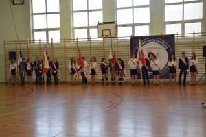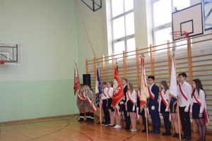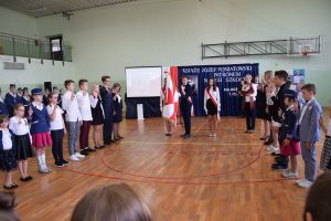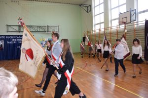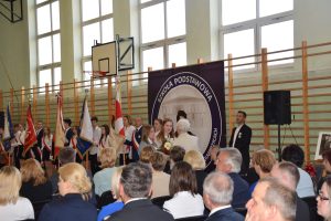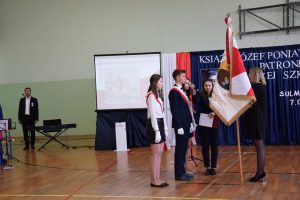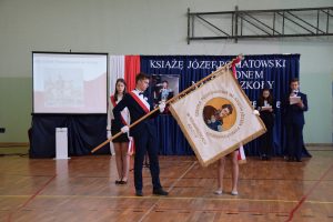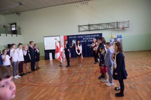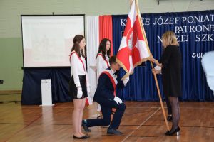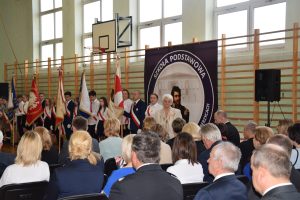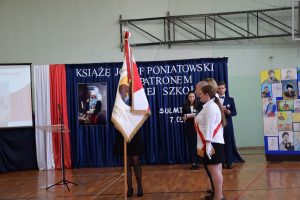 Kolejnym punktem uroczystości było przekazanie przez delegację rodziców sztandaru pani dyrektor, który następnie pani dyrektor przekazała uczniom. Potem nastąpił moment prezentacji sztandaru, złożenie uroczystego ślubowania przez przedstawicieli uczniów, rodziców i nauczycieli oraz po raz pierwszy odśpiewanie hymnu szkoły.