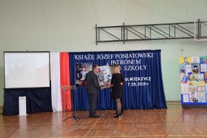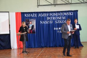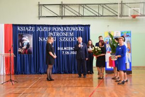 Wśród zaproszonych gości była pani Krystyna Mazela-Kozłowska, córka dawnego kierownika szkoły, pana Jakuba Mazeli, która w krótkim wystąpieniu przybliżyła postać swojego ojca.Następnie przewodniczący Rady Gminy, pan Tadeusz Kruszyński odczytał uchwałę w sprawie nadania imienia Szkole Podstawowej w Sulmierzycach oraz wręczył Akt Nadania pani dyrektor