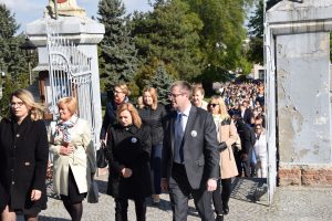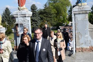 Po mszy delegacja uczniów udała się na pobliski cmentarz, by zapalić znicze na grobach zmarłych nauczycieli i pracowników szkoły, natomiast orszak przy dźwiękach muzyki Młodzieżowej Orkiestry Dętej z Sulmierzyc przemaszerował do szkoły. Tu nastąpiło odsłonięcie i poświęcenie pamiątkowej tablicy oraz złożenie kwiatów. Następnie w hali sportowej prowadzący powitali zaproszonych gości (przedstawicieli Kuratorium Oświaty, przedstawicieli organu prowadzącego szkołę, radnych, sołtysów, dyrektorów zaprzyjaźnionych szkół i przedszkoli, sponsorów, emerytowanych nauczycieli i pracowników szkoły oraz rodziców). Później przedstawiono prezentację dotyczącą historii szkoły w Sulmierzycach, którą przygotowała pani Justyna Skibińska.