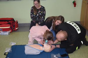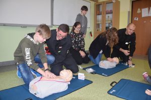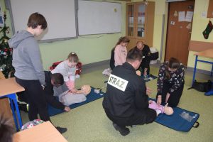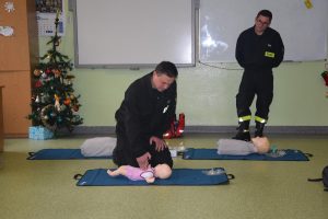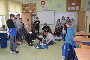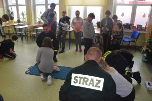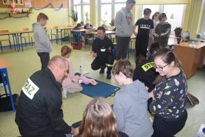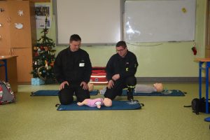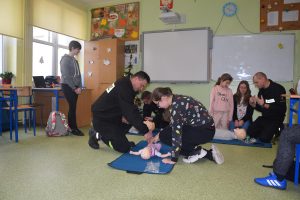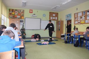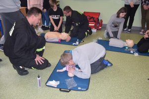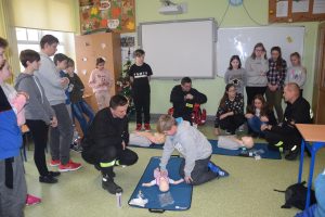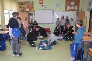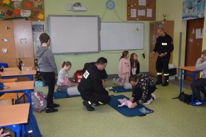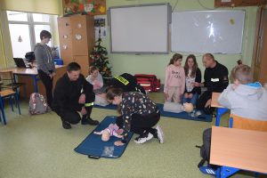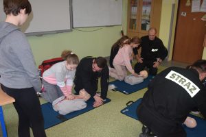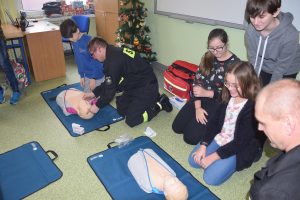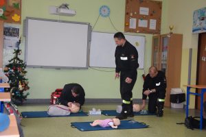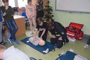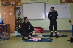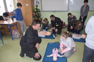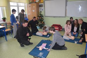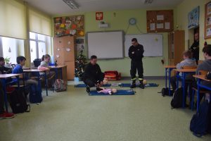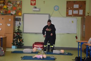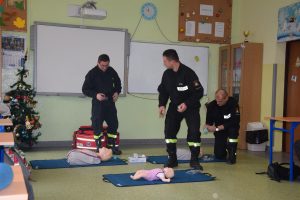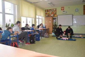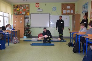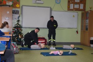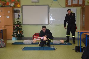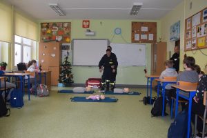 W dniu 7 stycznia 2020 roku klasa VIa wzięła udział w niecodziennej lekcji wychowawczej z udziałem strażaków z Ochotniczej Straży Pożarnej z Sulmierzyc. Tematem spotkania było omówienie etapów postępowania w przypadku udzielania pierwszej pomocy przedmedycznej. Uczniowie dowiedzieli się krok po kroku jak należy postępować w sytuacji znalezienia osoby poszkodowanej. Strażacy do prezentacji wykorzystali fantomy do resuscytacji oraz sprzęt ratownictwa medycznego ze swojej jednostki. Uczniowie chętnie podejmowali próby udzielania pierwszej pomocy na fantomach. Lekcja uświadomiła uczniom jak ważne jest posiadanie wiedzy i umiejętności w tym zakresie, gdyż zgodnie z obowiązującymi przepisami każdy z nas ma obowiązek udzielenia pomocy osobie potrzebującej.