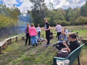 Gospodarze „Zbychewki – państwo Ewa i Zbigniew – niezwykle ciepło przyjęli gości ze szkoły w Sulmierzycach. Uczniowie uczestniczyli w warsztatach lepienia z gliny, a także odbyli przejażdżkę traktorem z wozem drabiniastym po lesie. Wszystko to było dla nich bardzo ciekawe. Pani Ewa opowiedziała dzieciom o swojej pracy, wyjaśniła, w jaki sposób tworzy się ceramiczne wyroby, zdradziła tajniki ich wykonywania, zdobienia i barwienia. W czasie spotkania każdy uczestnik otrzymał swój kawałek gliny i dzięki wskazówkom artystki samodzielnie ulepił domek oraz inną wymyśloną przez siebie ozdobę. Okazało się, że piątoklasiści byli bardzo pomysłowi i precyzyjni, a ich oryginalne prace bardzo się wszystkim podobały. Gdy uczniowie klasy Va lepili z gliny, ich koleżanki i koledzy z klasy Vb wybrali się traktorem pana Zbyszka do lasu. Tam wysłuchali ciekawych opowieści o zwierzętach, roślinach i klimacie. Dzieci miały okazję policzyć wiek sosny, dowiedzieć się, co to jest jemioła i jaki ma wpływ na drzewa, a także nauczyć się rozpoznawać rydze. Był czas na spacer, zabawę w chowanego, jazdę na rowerze, a nawet na skoki na trampolinie i relaks na huśtawce. Gospodarze zadbali też o to, by nikt nie wyjechał od nich głodny i zorganizowali ognisko z pieczeniem kiełbasek. Naprawdę wszyscy czuliśmy się tam jak u siebie w domu. „Zbychewka” to miejsce niby zwyczajne, a jednak niezwykłe. Jego gospodarze to ludzie bardzo pogodni. Widać, że kochają to miejsce i ludzi, a swoim entuzjazmem, optymizmem i radością życia zarażają innych. Na pewno warto zaplanować wizytę w gospodarstwie pani Ewy i pana Zbyszka, a kto raz tutaj przyjedzie, będzie chciał wrócić – tak jak piątoklasiści ze Sulmierzyc…