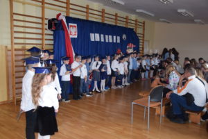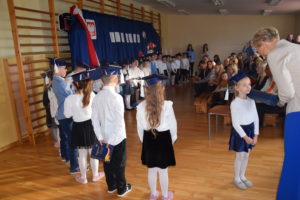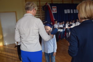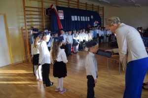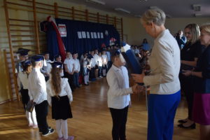 Następnie pierwszaki złożyły uroczyste ślubowanie. Po przysiędze pani wicedyrektor dokonała aktu pasowania na ucznia.