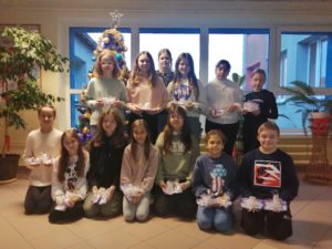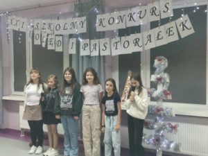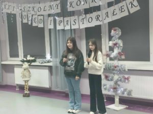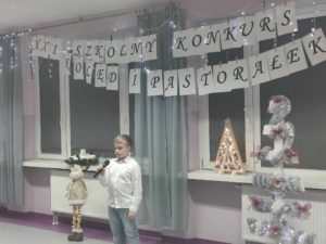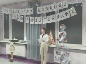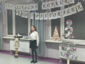 W radosnej atmosferze, przy blasku choinki uczniowie klas IV-VIII wzięli udział w przeglądzie kolęd i pastorałek w języku angielskim i niemieckim. Zaangażowanie uczestników i pomysłowość w aranżacji przygotowanych utworów było zaskakujące.