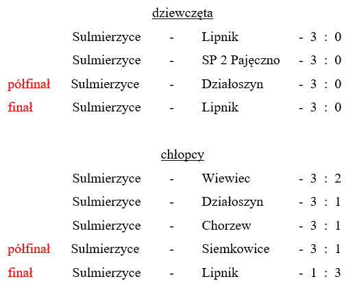 Mamy kolejna dwa medale w tenisie stołowym. Dziewczęta pewnie wygrały swoją kategorię, natomiast chłopcy zajęli drugie miejsce. W finale musieli uznać wyższość kolegów z Wiewca, których pokonali w eliminacjach. Złote medale zdobyły Laura Zięba i Maria Popiołek, a srebrne zdobyli Igor Spaliński i Natan Loręcki.