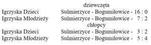 W rywalizacji z SP Bogumiłowice wygraliśmy we wszystkich czterech kategoriach. O ile dziewczęta pewnie wygrały swoje mecze, to chłopcy stoczyli zaciętą walkę o każdy punkt. Ostatecznie wygrali w obu kategoriach, ale minimalną różnicą bramek.