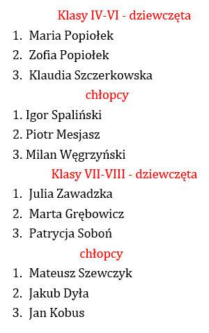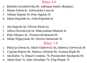 W zawodach wzięły udział dwie grupy naszych zawodników dziewczęta i chłopcy. Nasi reprezentanci spisali się bardzo dobrze. Dziewczęta – Laura Zięba i Maria Popiołek zajęły trzecie miejsce, a chłopcy Igor Spaliński i Natan Loręcki czwarte.