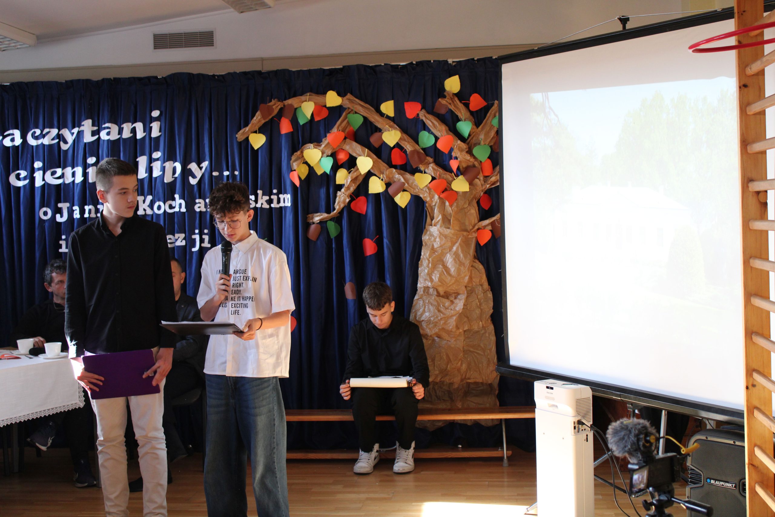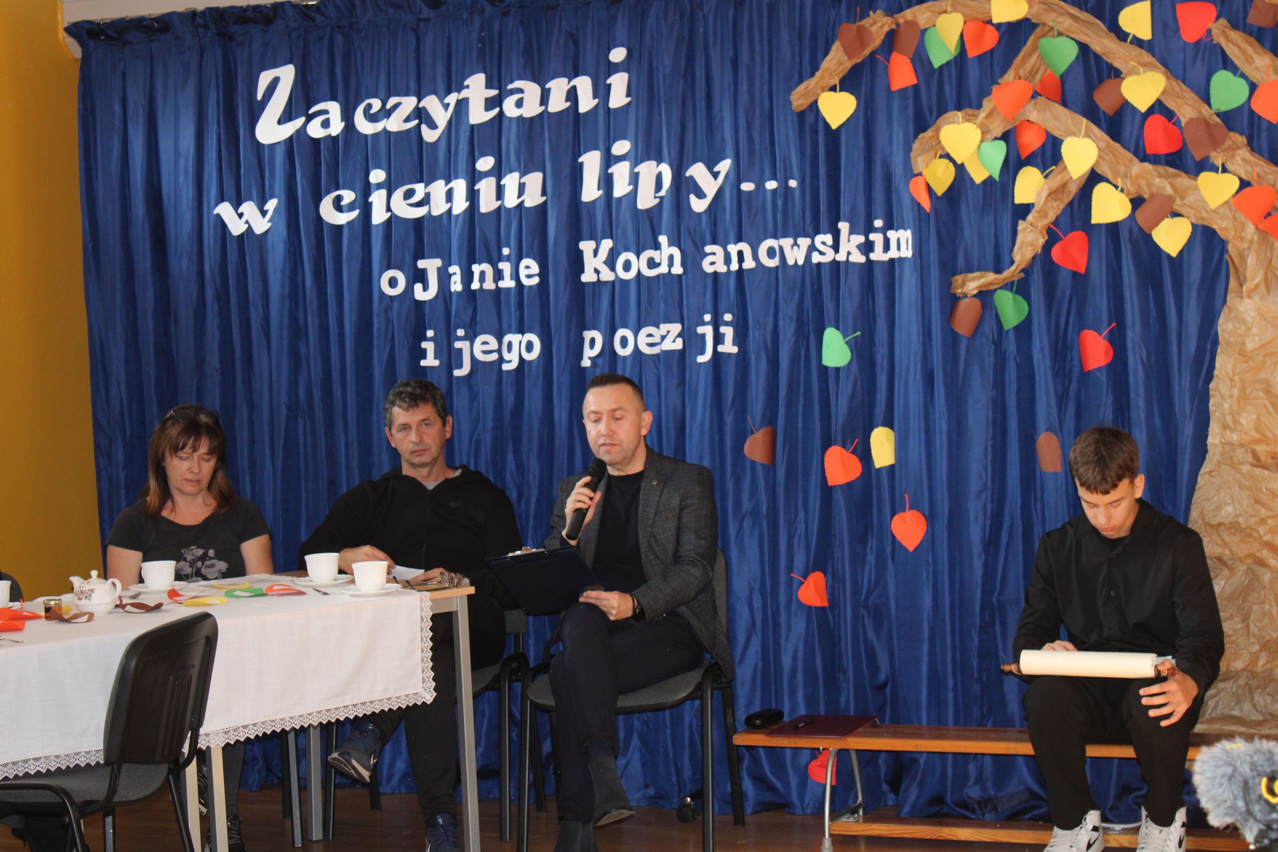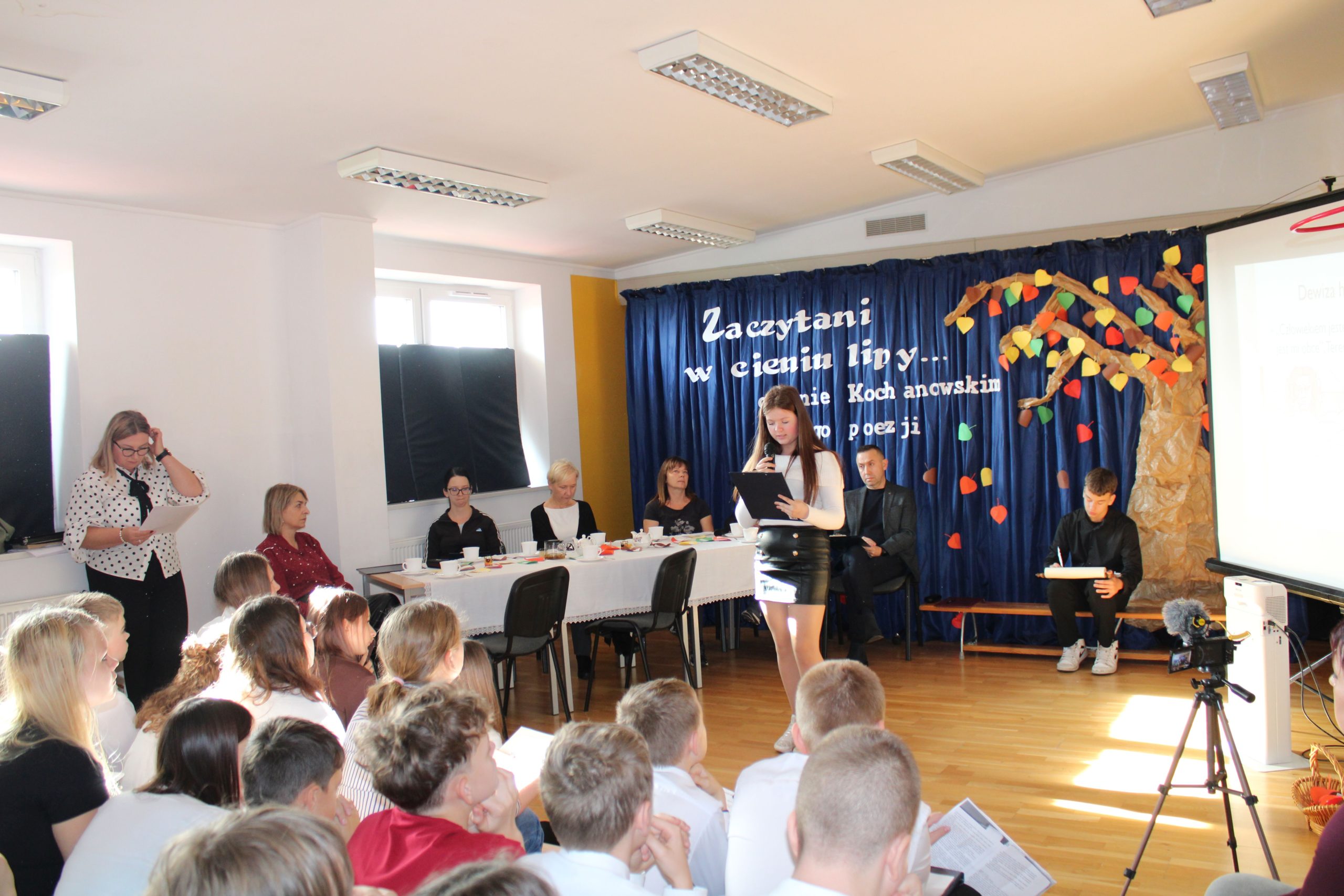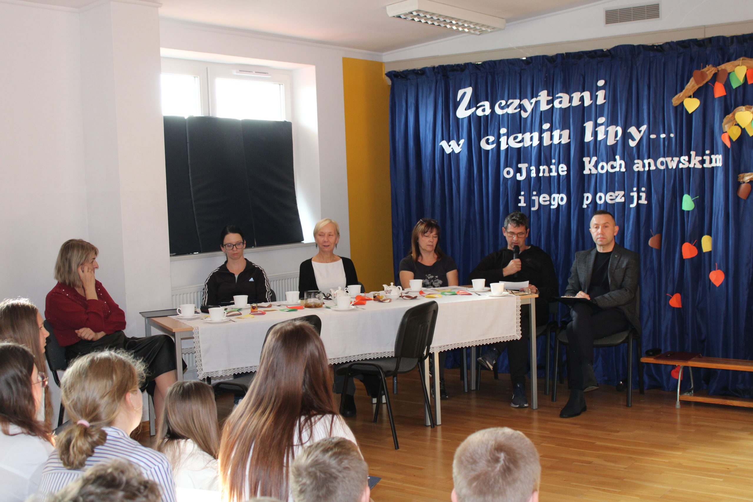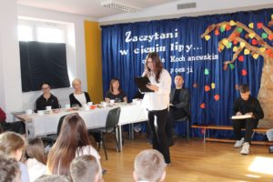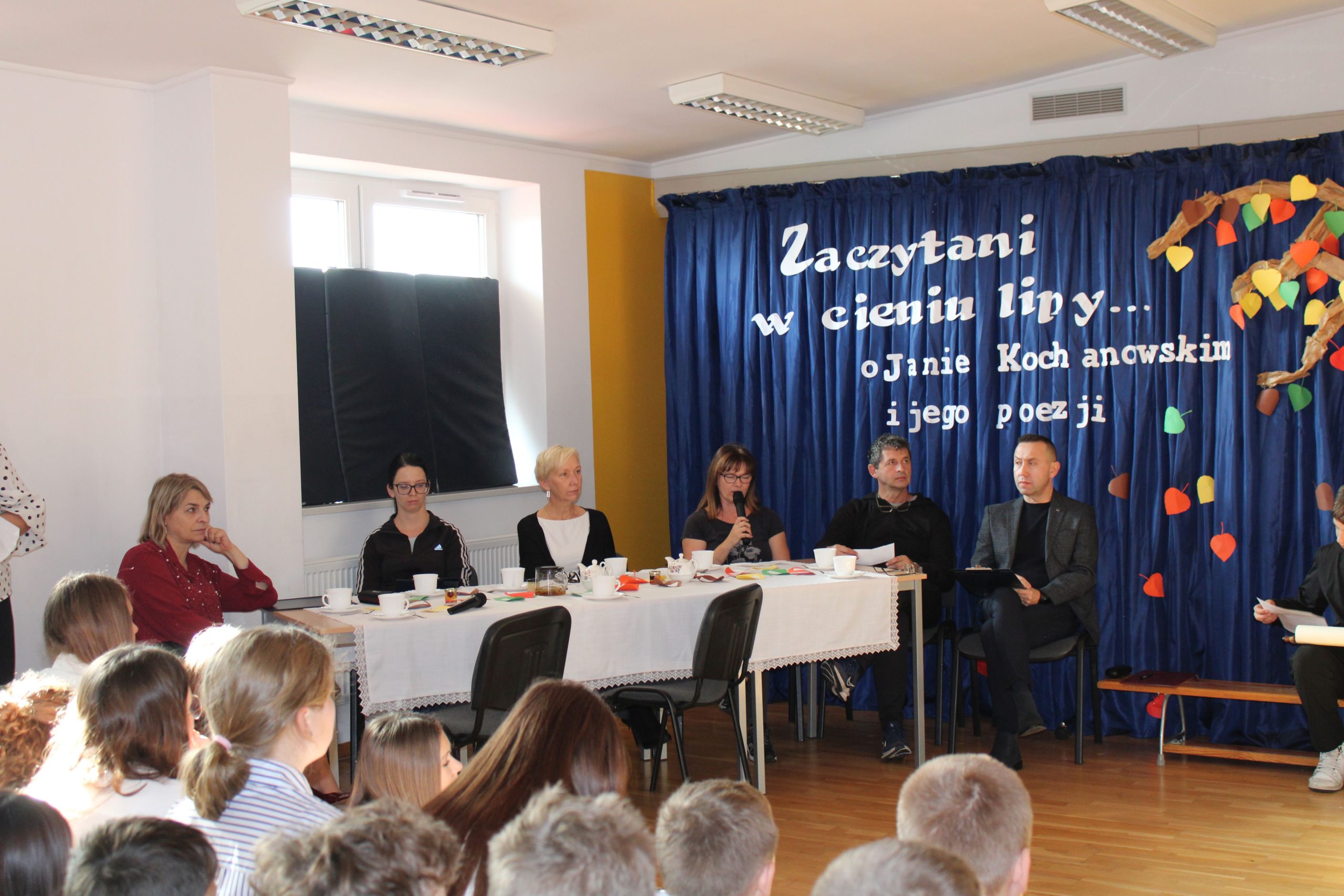 „Zaczytani w cieniu lipy – o Janie Kochanowskim i jego poezji” to temat lekcji otwartej przeprowadzonej 29 października w naszej szkole, w czasie której zaproszeni goście i uczniowie z klas siódmych i ósmych czytali i recytowali utwory Jana z Czarnolasu. Ponadto z fragmentów książki J. Poraźniskiej pt. Kto mi dał skrzydła i z prezentacji multimedialnej uczniowie dowiedzieli się wielu ciekawostek o życiu i pracy twórczej tego wybitnego renesansowego poety. Otrzymali także karty pracy nawiązujące do poruszanych zagadnień oraz nadal aktualne i ponadczasowe sentencje pochodzące z wybranych pieśni ojca literatury polskiej zamieszczone na jesiennych lipowych liściach. W krainę poezji mistrza Jana daliśmy się ponieść dzięki klimatycznej muzyce i wonnej, lipowej herbacie z miodem.