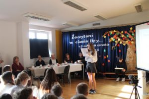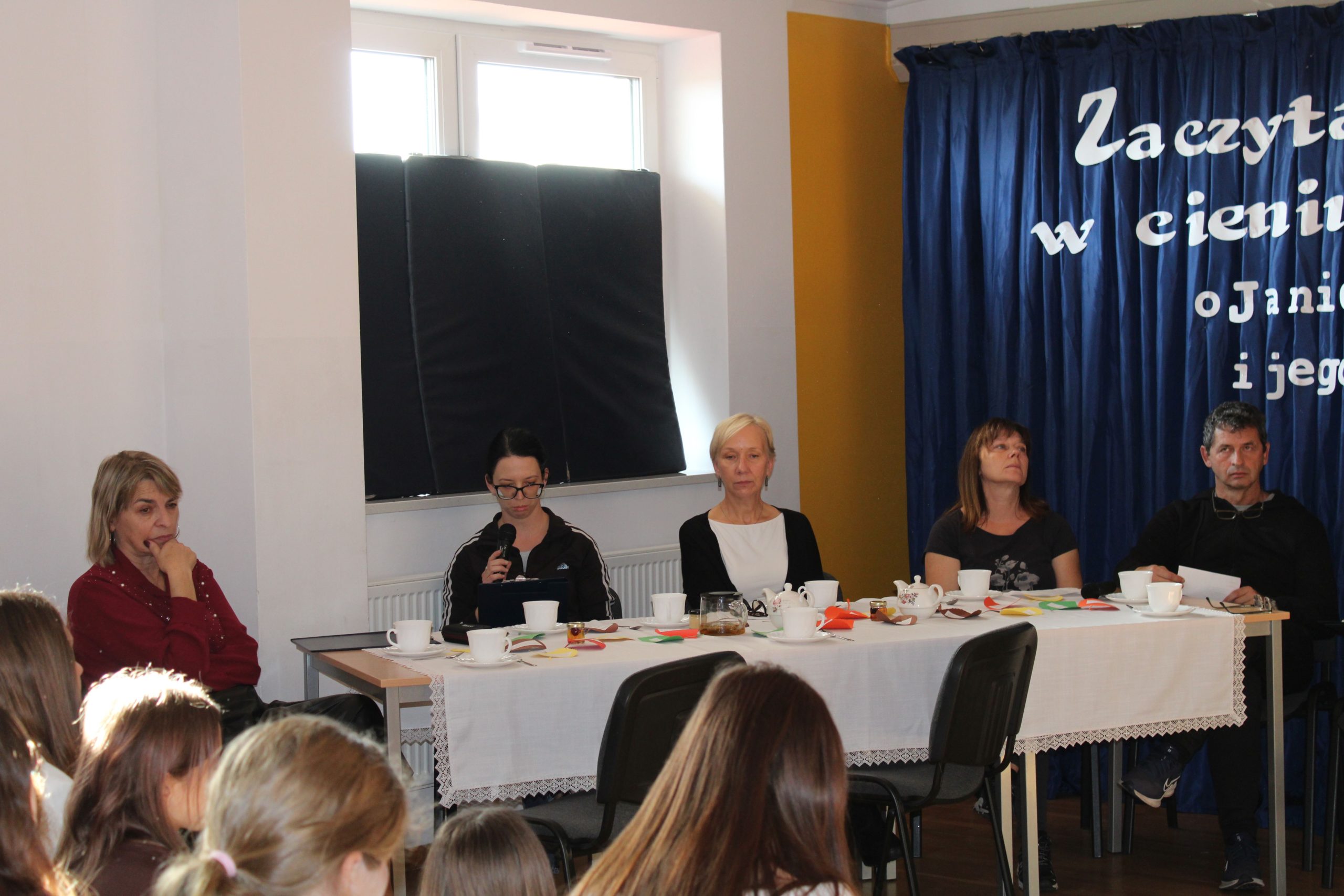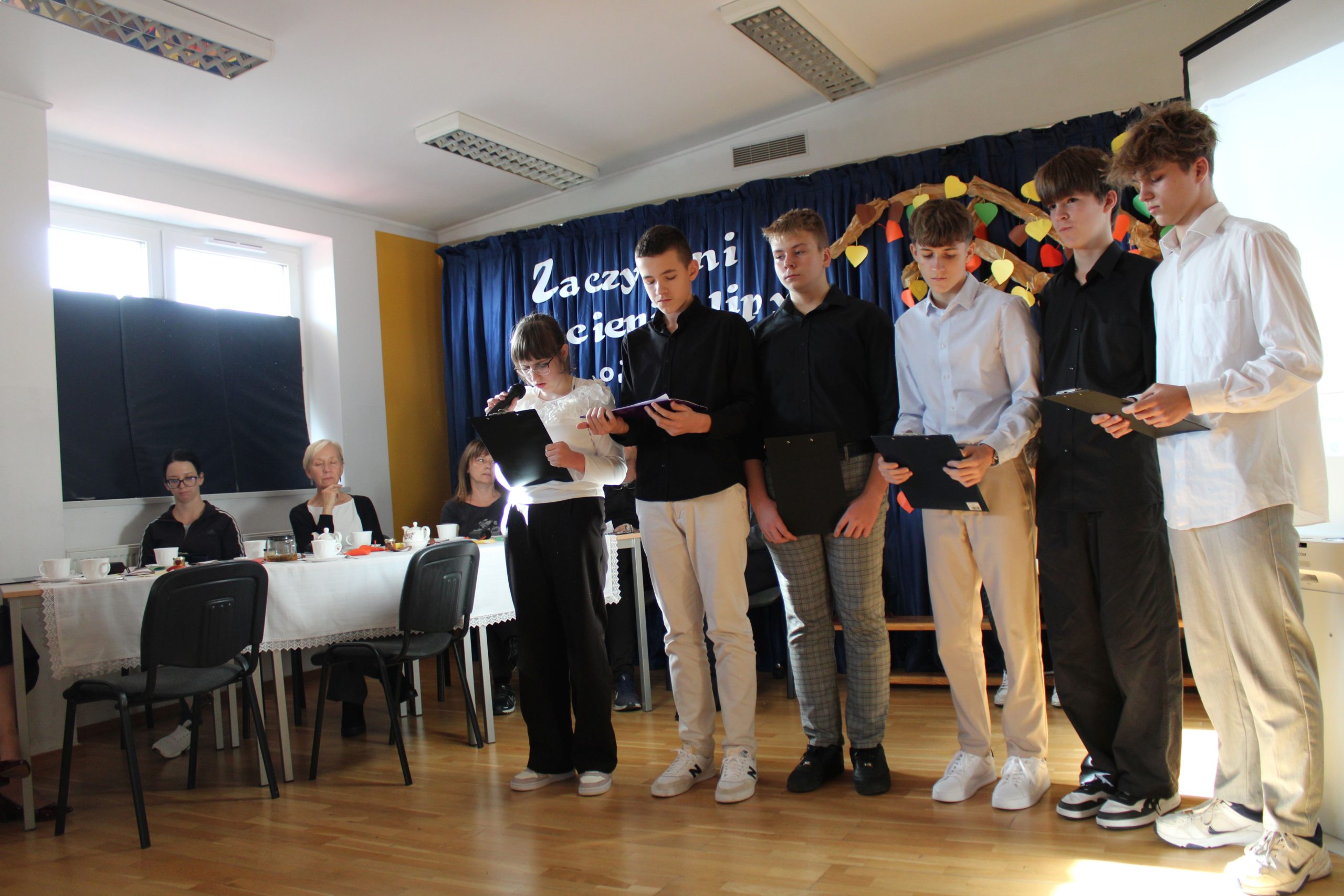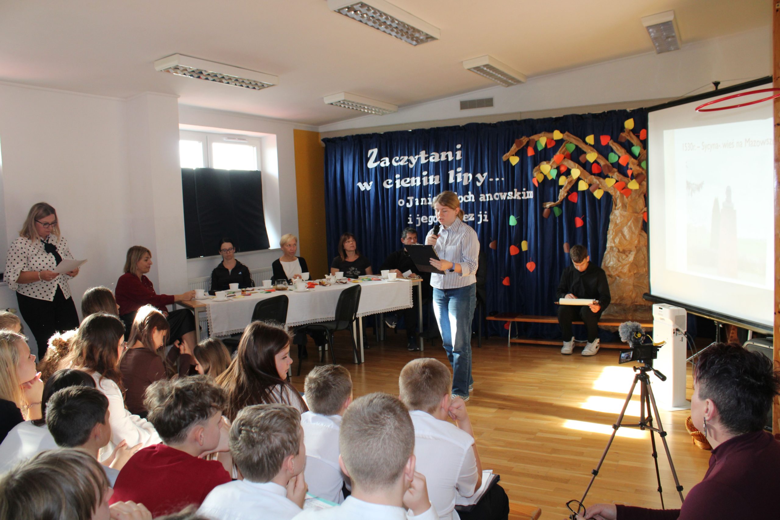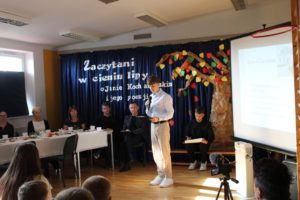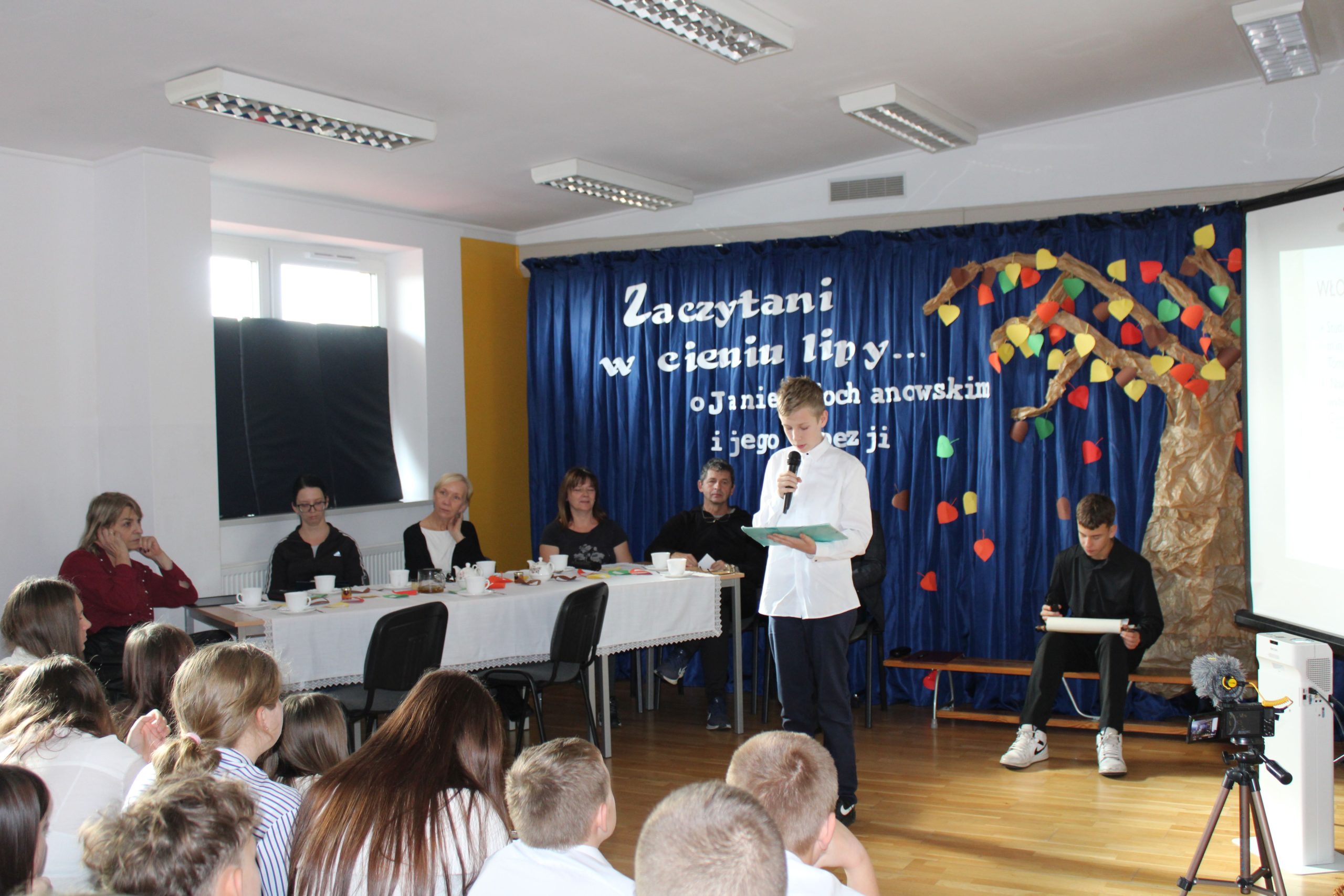 „Zaczytani w cieniu lipy – o Janie Kochanowskim i jego poezji” to temat lekcji otwartej przeprowadzonej 29 października w naszej szkole, w czasie której zaproszeni goście i uczniowie z klas siódmych i ósmych czytali i recytowali utwory Jana z Czarnolasu. Ponadto z fragmentów książki J. Poraźniskiej pt. Kto mi dał skrzydła i z prezentacji multimedialnej uczniowie dowiedzieli się wielu ciekawostek o życiu i pracy twórczej tego wybitnego renesansowego poety. Otrzymali także karty pracy nawiązujące do poruszanych zagadnień oraz nadal aktualne i ponadczasowe sentencje pochodzące z wybranych pieśni ojca literatury polskiej zamieszczone na jesiennych lipowych liściach. W krainę poezji mistrza Jana daliśmy się ponieść dzięki klimatycznej muzyce i wonnej, lipowej herbacie z miodem.