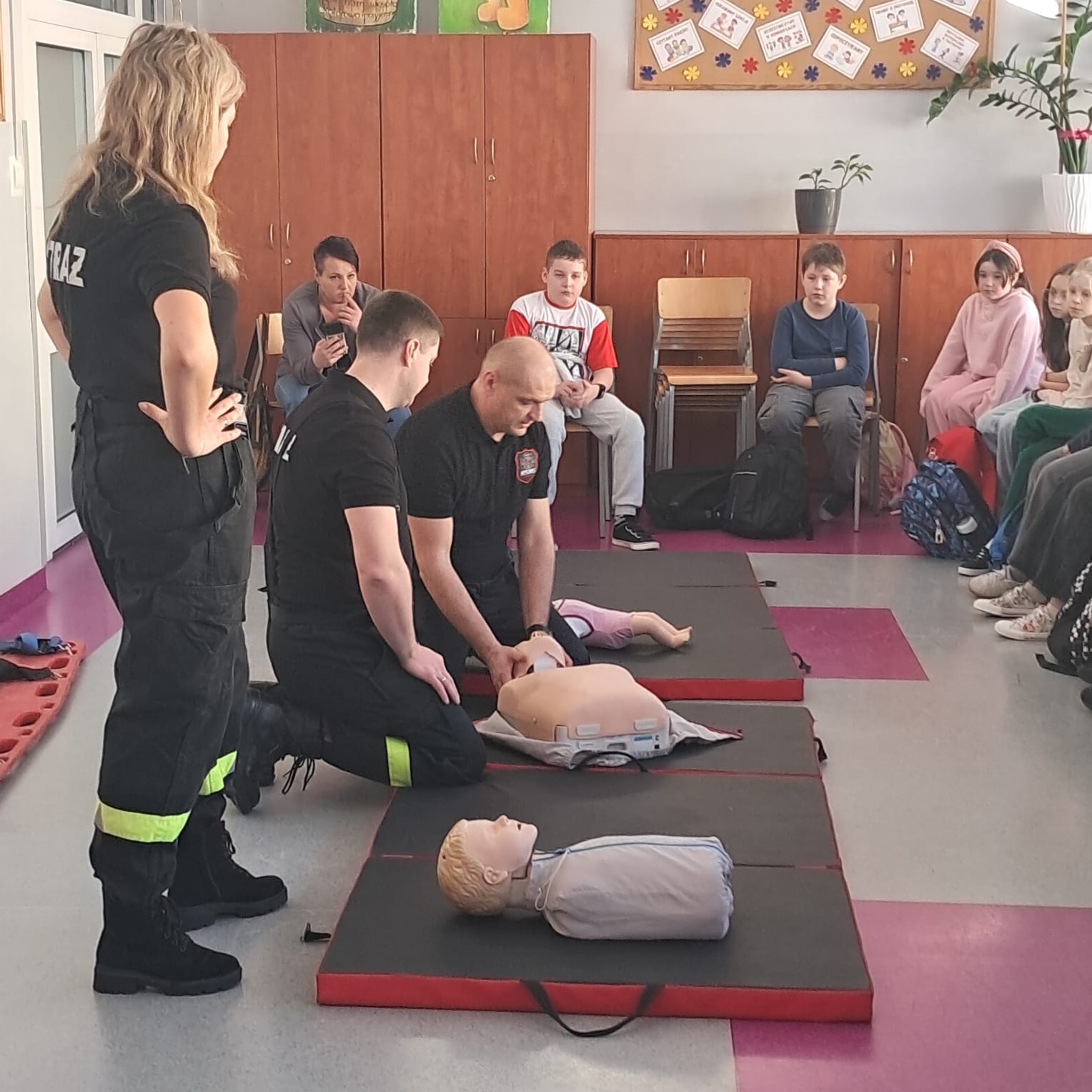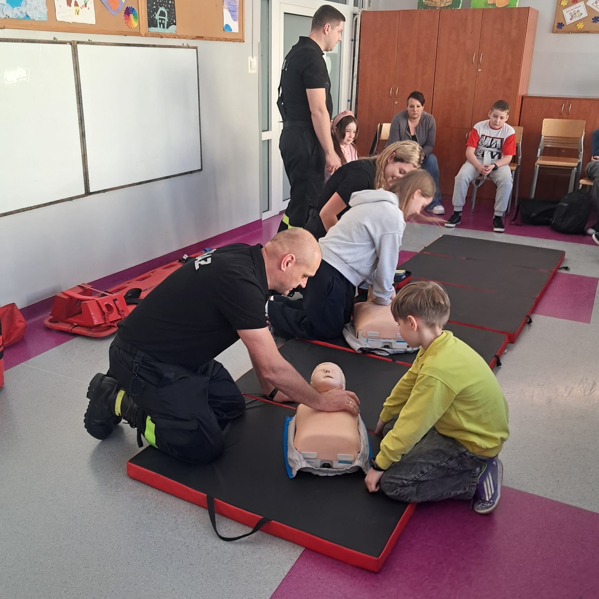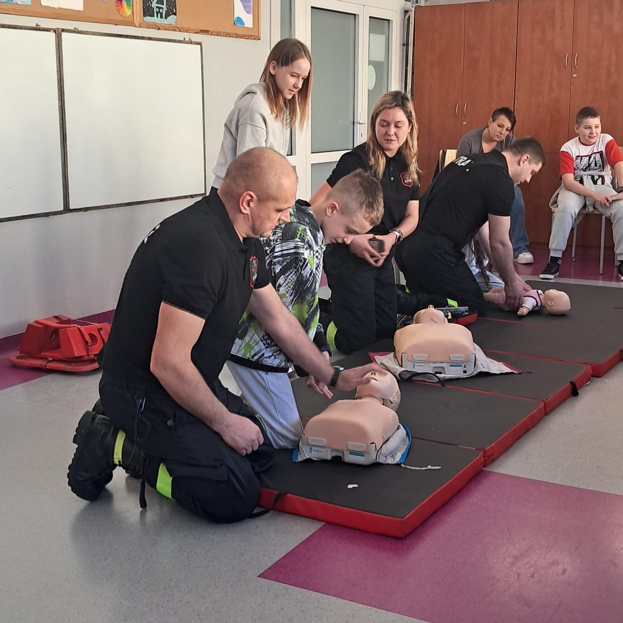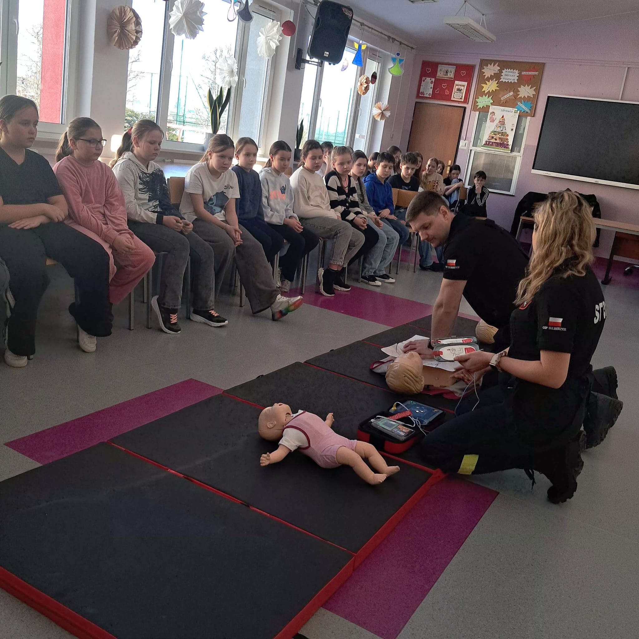 Podczas zajęć strażacy omówili podstawowe zasady udzielania pierwszej pomocy, zaprezentowali resuscytację krążeniowo-oddechową (RKO) a także pokazali, jak w praktyce korzystać z defibrylatora AED. Uczniowie mieli również okazję przećwiczyć postępowanie w przypadku urazów kończyn (np. podejrzenia złamania), nauczyć się prawidłowego opatrywania ran, zasad postępowania przy oparzeniach i zakrztuszeniach, a także ułożenia poszkodowanego w pozycji bocznej bezpiecznej.
