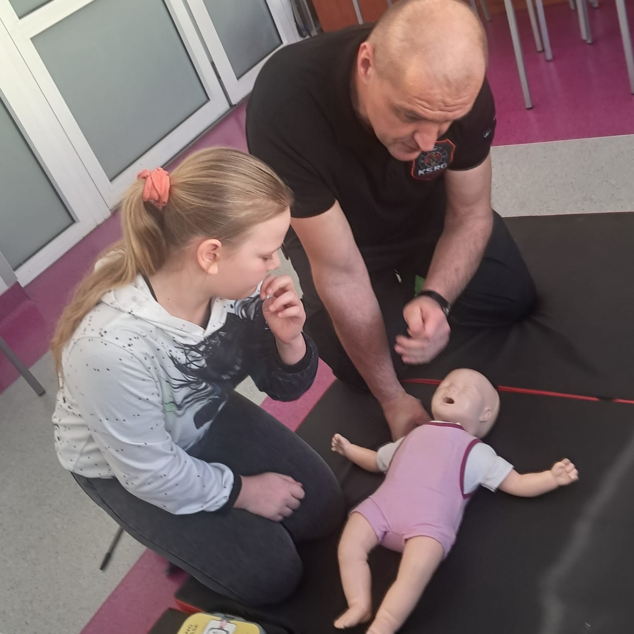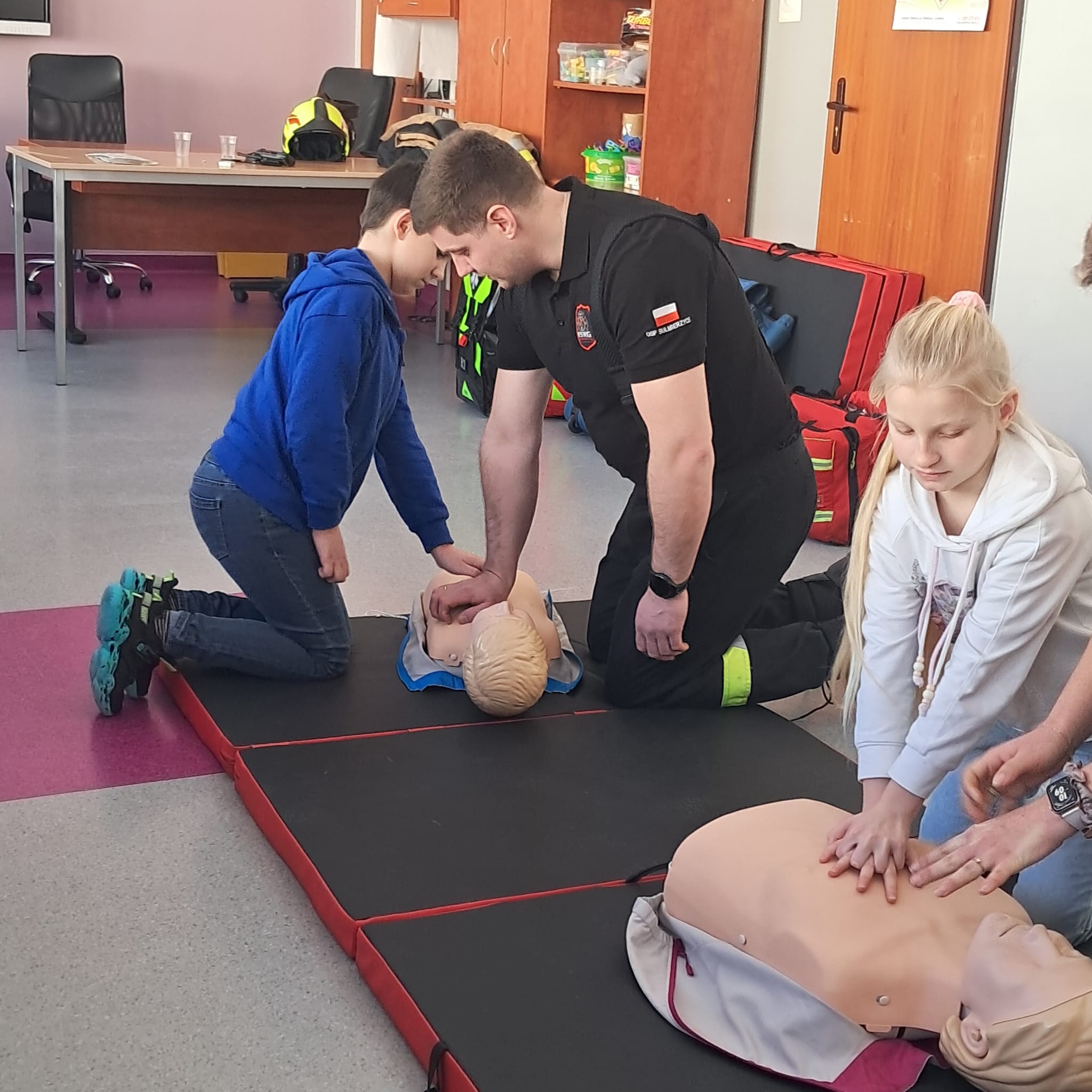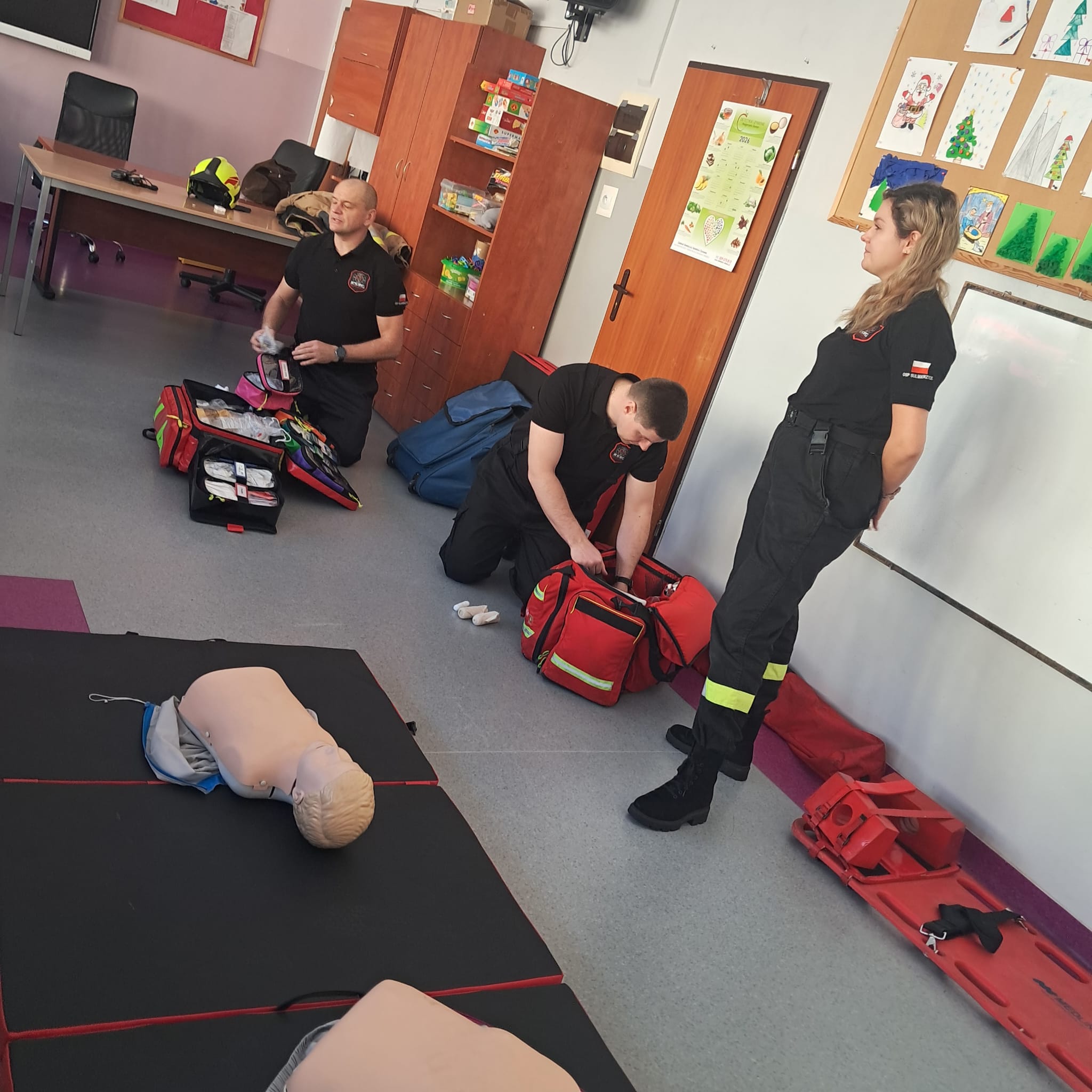 Podczas zajęć strażacy omówili podstawowe zasady udzielania pierwszej pomocy, zaprezentowali resuscytację krążeniowo-oddechową (RKO) a także pokazali, jak w praktyce korzystać z defibrylatora AED. Uczniowie mieli również okazję przećwiczyć postępowanie w przypadku urazów kończyn (np. podejrzenia złamania), nauczyć się prawidłowego opatrywania ran, zasad postępowania przy oparzeniach i zakrztuszeniach, a także ułożenia poszkodowanego w pozycji bocznej bezpiecznej.
