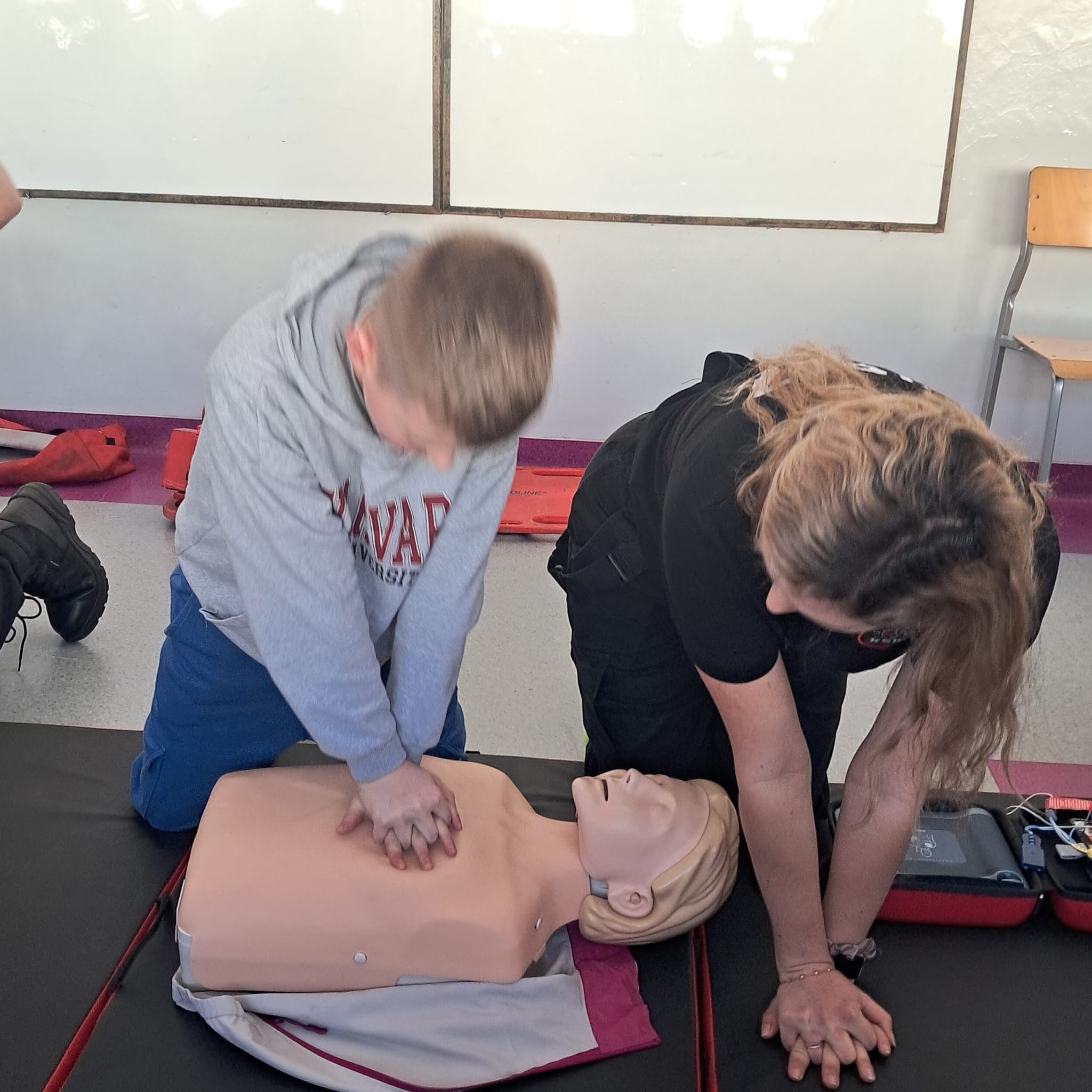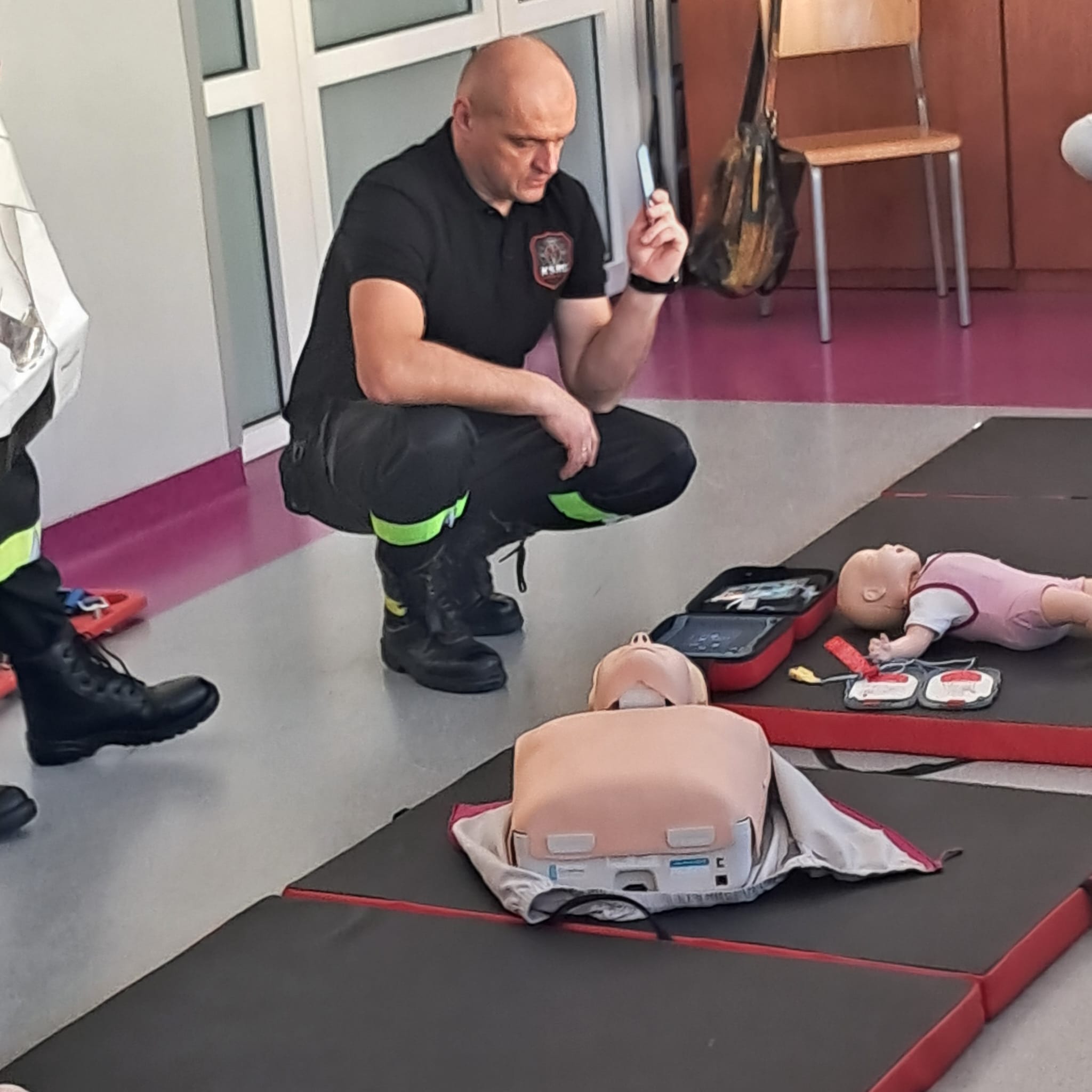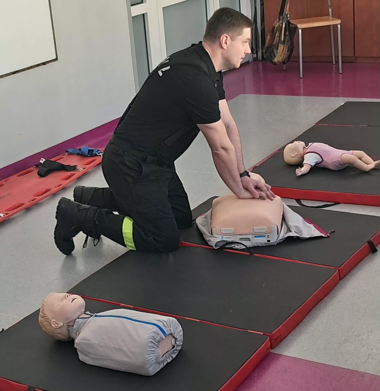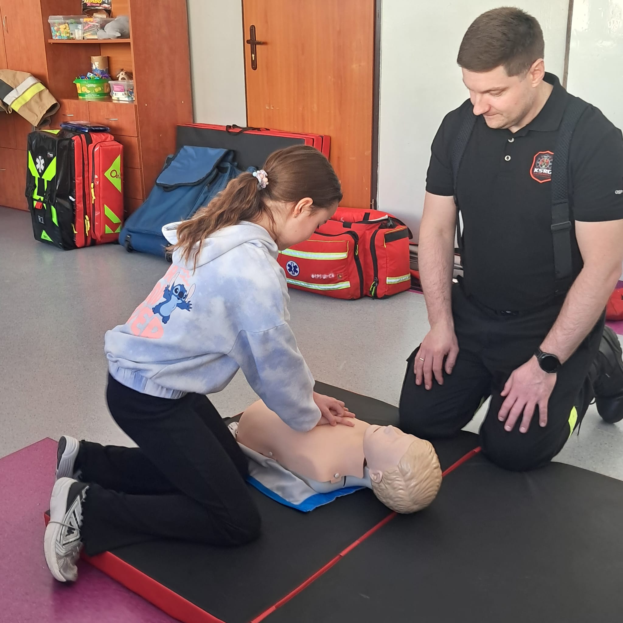 Podczas zajęć strażacy omówili podstawowe zasady udzielania pierwszej pomocy, zaprezentowali resuscytację krążeniowo-oddechową (RKO) a także pokazali, jak w praktyce korzystać z defibrylatora AED. Uczniowie mieli również okazję przećwiczyć postępowanie w przypadku urazów kończyn (np. podejrzenia złamania), nauczyć się prawidłowego opatrywania ran, zasad postępowania przy oparzeniach i zakrztuszeniach, a także ułożenia poszkodowanego w pozycji bocznej bezpiecznej.