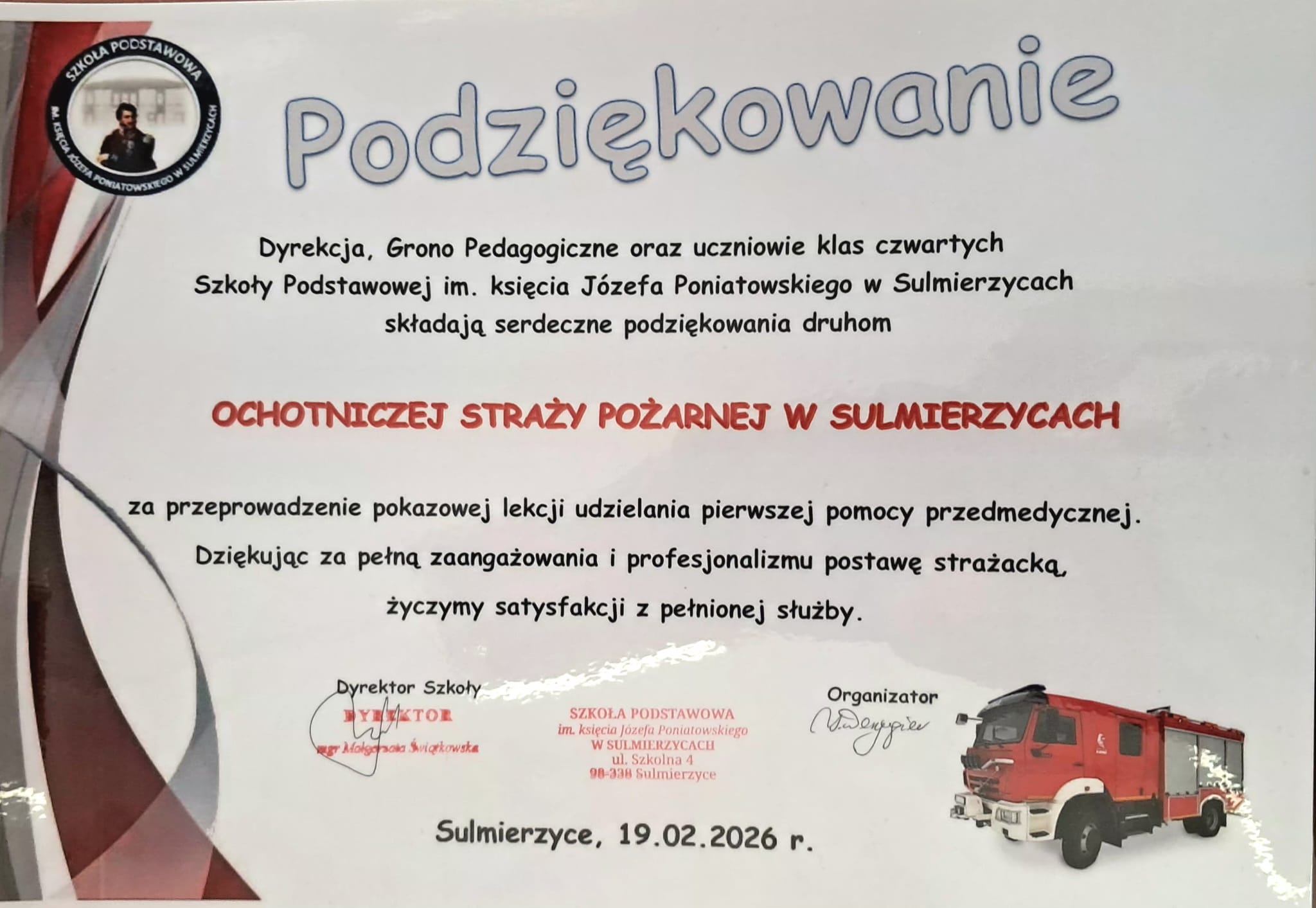 Na zaproszenie szkoły odpowiedzieli druhowie z Ochotniczej Straży Pożarnej w Sulmierzycach, którzy w przystępny i bardzo interesujący sposób przekazali uczniom najważniejsze zasady ratowania zdrowia i życia oraz właściwego reagowania